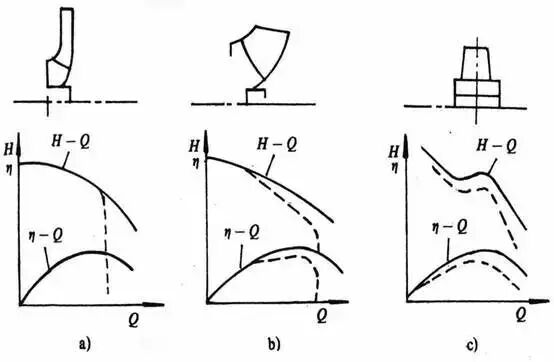 对于中高比转速,流道短而宽,因而气泡从发生发展到充满整个流道需要一个过渡过程,相应的性能曲线开始是缓慢下降,之后增加到某一流量时才急剧下降。